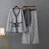 Three‑Piece Ensemble – High‑waist wide trousers, V‑neck sleeveless top and belted cardigan for total polish.